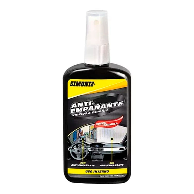Antiempañante Simoniz 120Ml ¡Permite ver claramente! Anti-empañante Simoniz® esta formulado para prevenir el empañamiento instantáneamente de vidrios y espejos interiores, anteojos, caretas y visores. Producto de uso interno. Se recomienda que el vidrio/visor este totalmente limpio y desengrasado.