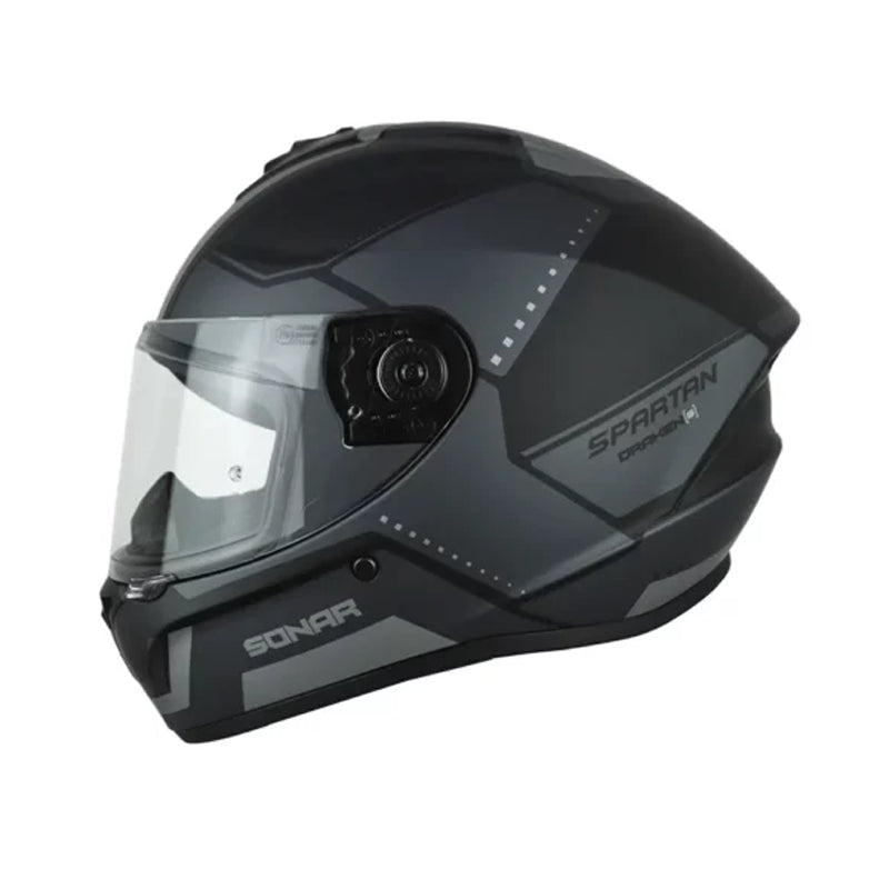 Casco Spartan Draken S Sonar Negro Gris Nota: El color puede ser ligeramente diferente debido a la calibración del color de cada monitor individual. Este casco integral increíblemente agresivo viene con líneas aerodinámicas frontales que se deslizan a lo largo del casco hasta su alerón integrado, haciendo del Draken un casco de características excepcionales a un precio increíble. Este casco cuenta con la certificación europea ECE 22.06 que es una de las certificaciones más exigentes del mundo. La calota está fabricada con policarbonato moldeado de alto impacto y contiene ventilaciones en la parte frontal, superior y trasera para extraer el aire caliente generado por el cuerpo humano.