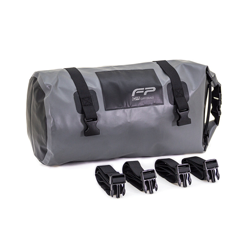 Maleta Impermeable Fp Drybag C15 Negro Gris La Dry Bag Tubular de 15 litros Fireparts brinda mucha seguridad ya que tiene varios puntos de amarre lo que significa que no importa por el terreno que pases, la Dry Bag tubular de 15 litros Fireparts no se va a caer. Algo muy bueno de esta dry bag es que por su forma la puedes amarrar a los herrajes de alforjas para maletas blandas lo que la hace muy versátil pues esto puede ampliar tu capacidad de carga. Características: